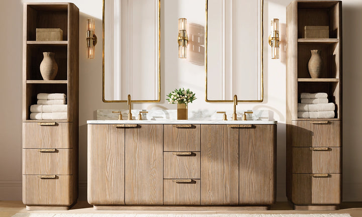 • Hardware crafted of hand-cast stainless steel with a textured finish. Greige European Fir features Champagne hardware; all other finishes feature Cast Aged Brass hardware.