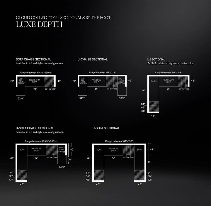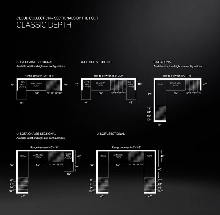 • When configuring a sectional, choose Classic or Luxe for all components. Can only be combined with other Cloud sectional components.