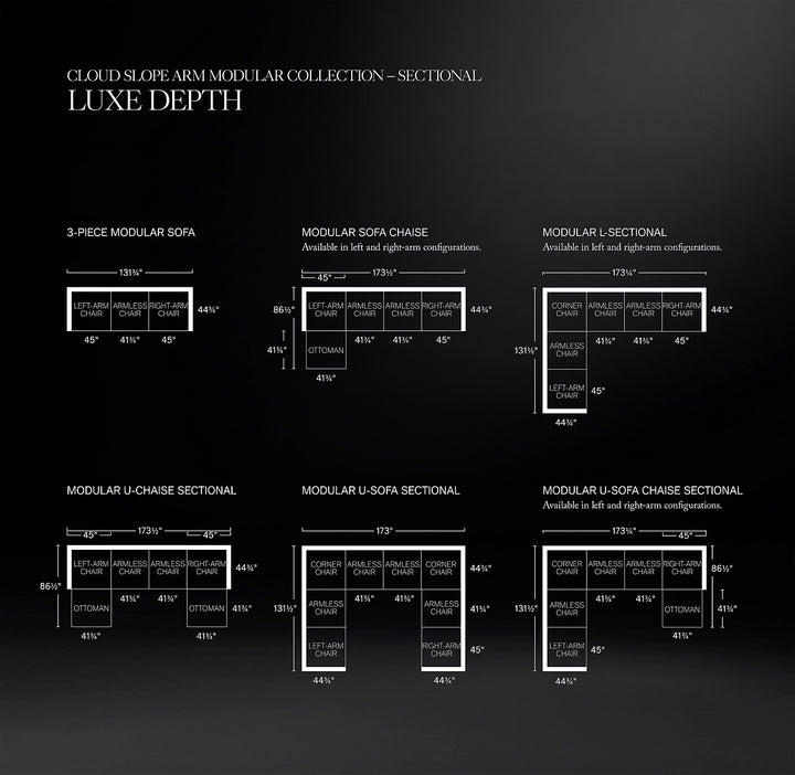 • When configuring a sectional, choose Classic or Luxe for all components. Can only be combined with other Cloud Slope Arm sectional components.