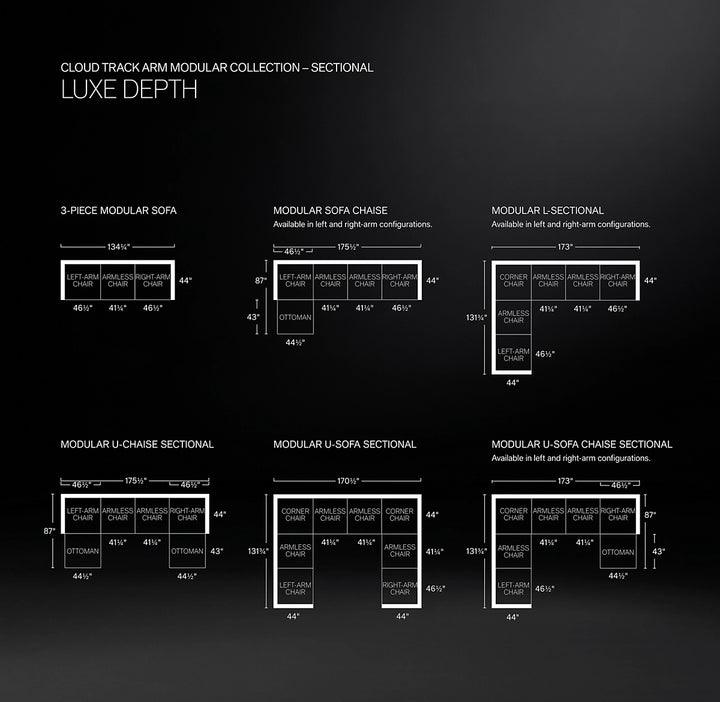 • When configuring a sectional, choose Classic or Luxe for all components. Can only be combined with other Cloud Track Arm sectional components.