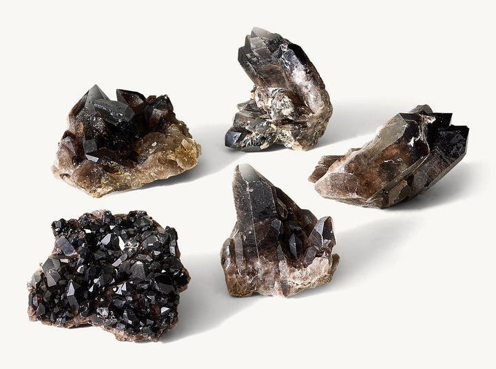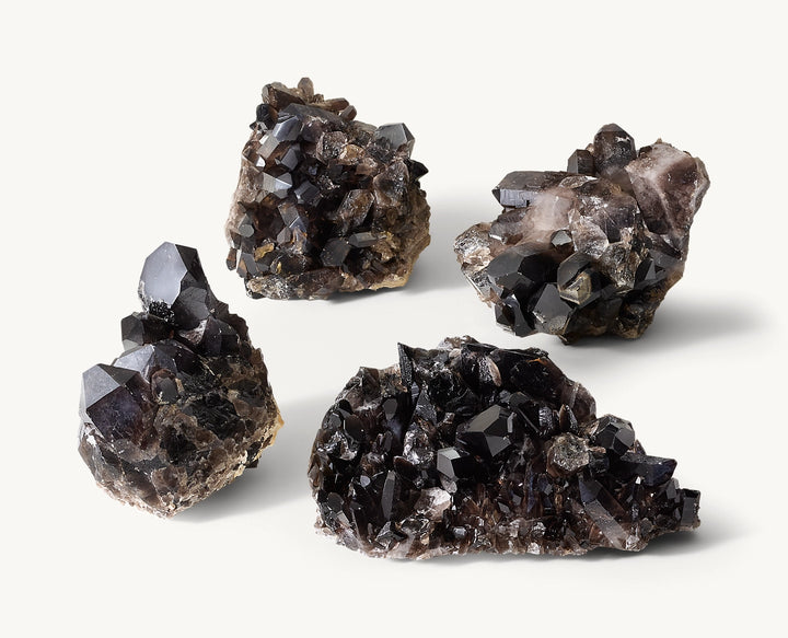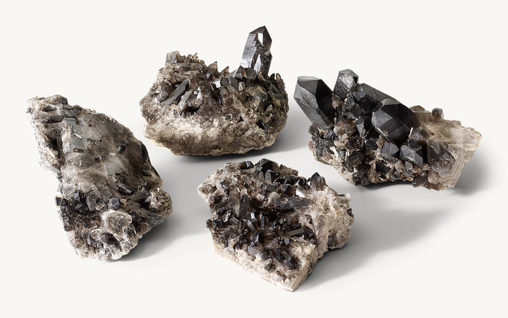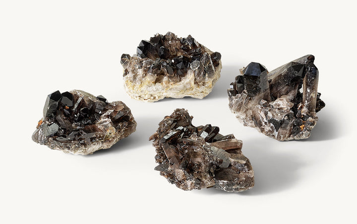 • Quartz crystal formation features clusters of the prismatic gemstone with black smoke hues