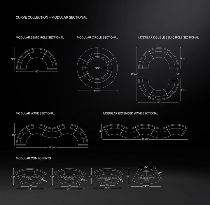 • Wave sectional consists of 1 left-arm concave sofa, 2 armless concave sofas, 1 armless convex sofa and 1 right-arm concave sofa