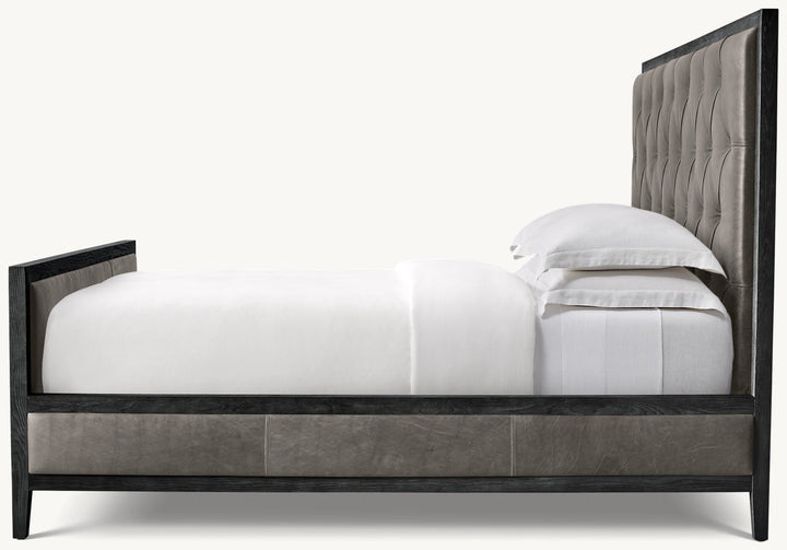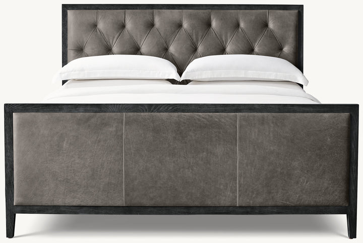 French Contemporary Leather Diamond-Tufted Panel Bed with Footboard
