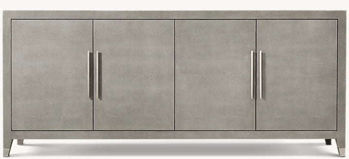 • Design details include solid metal capped feet and meticulously pieced leather panels that reflect the look of classic shagreen