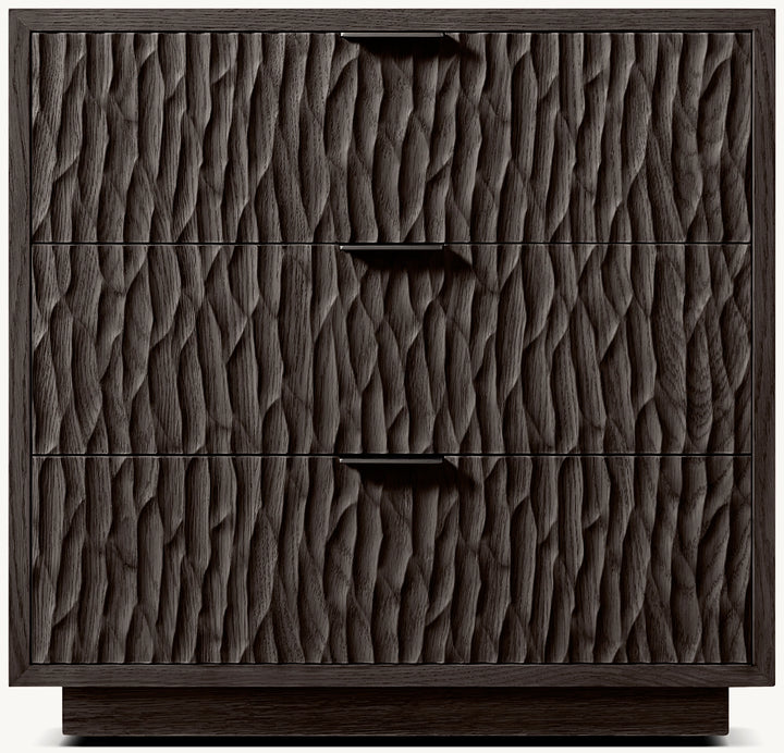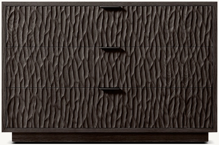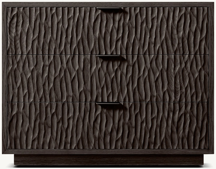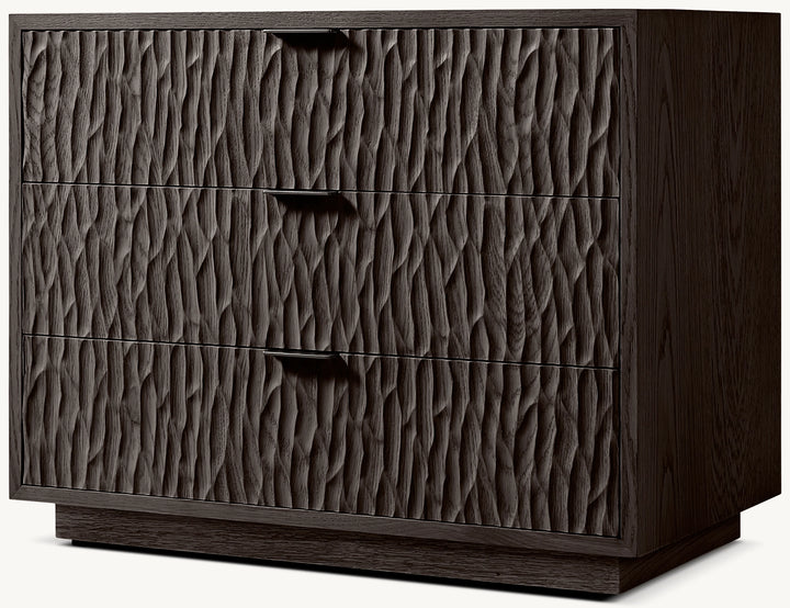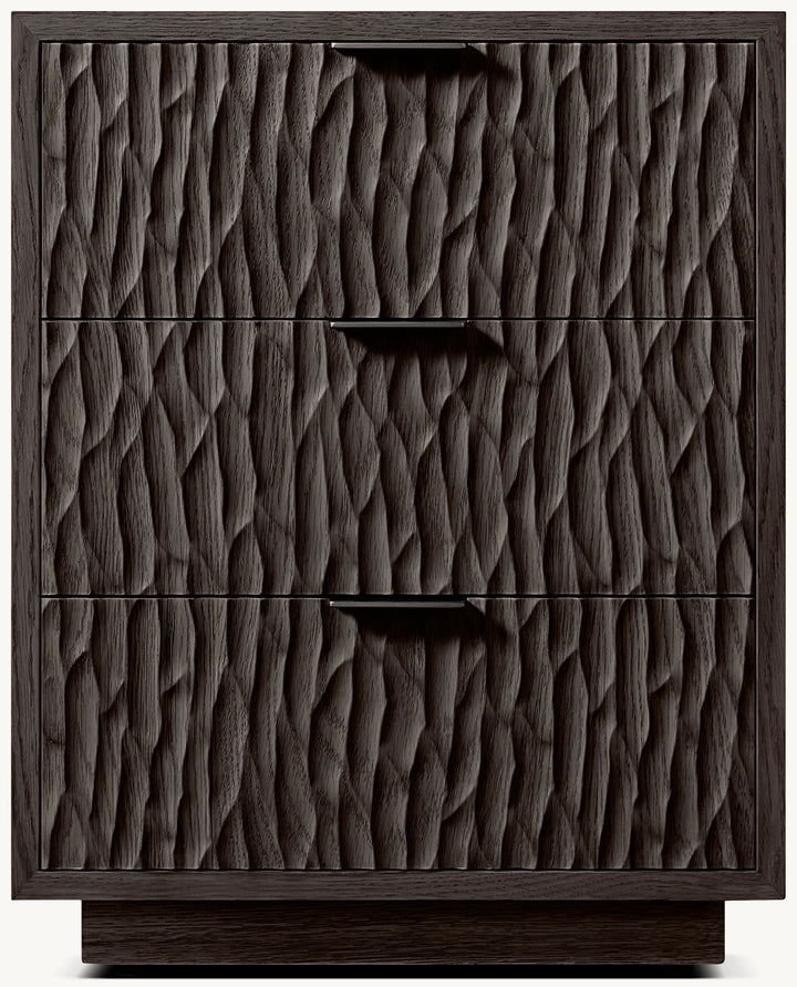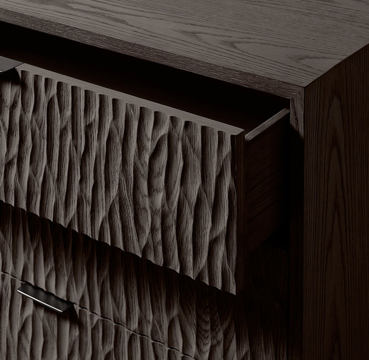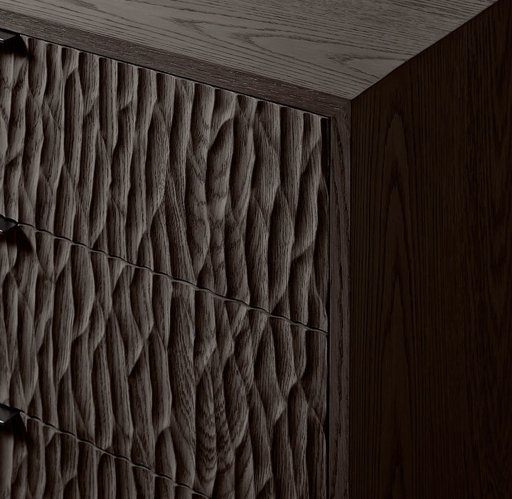 • Oak drawer fronts feature a deeply textured, chiseled surface in a meticulously crafted pattern