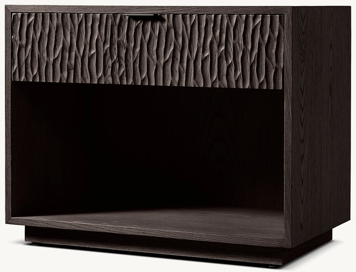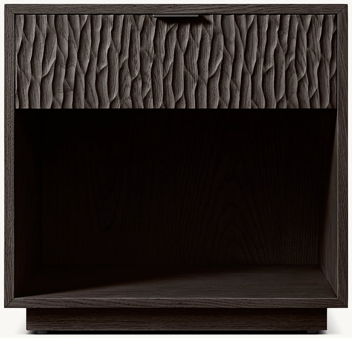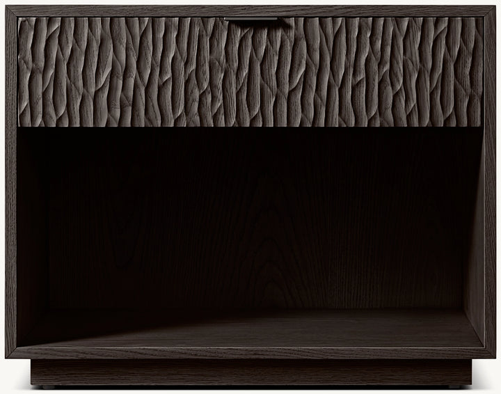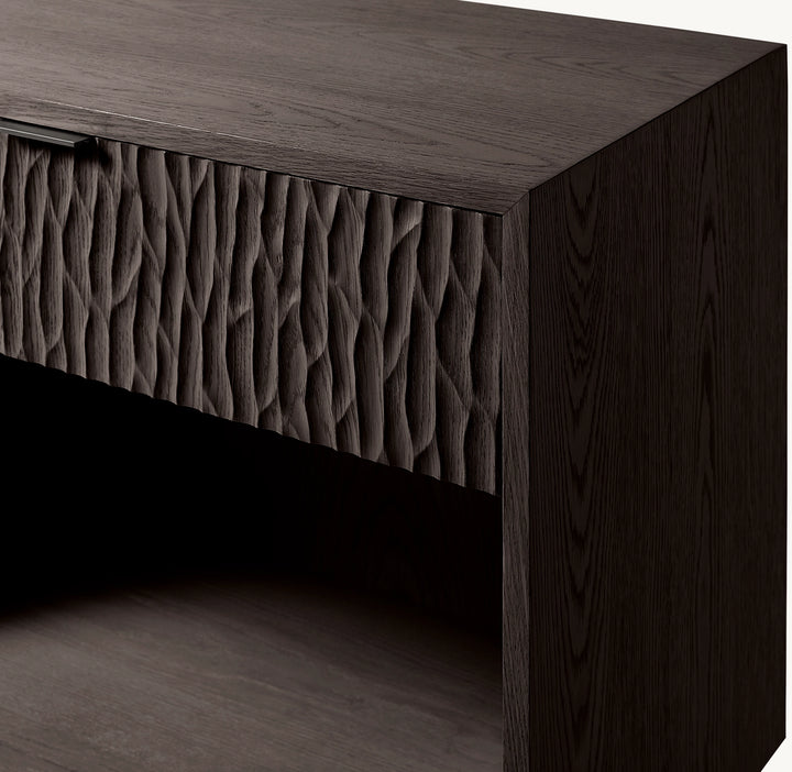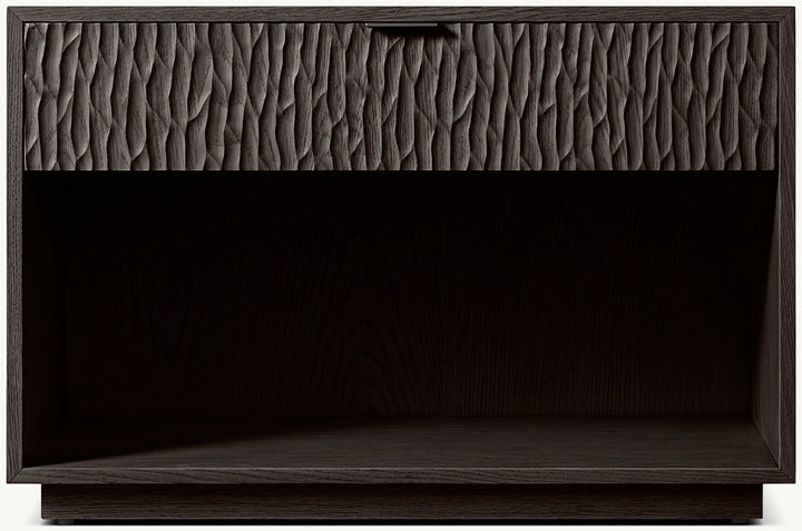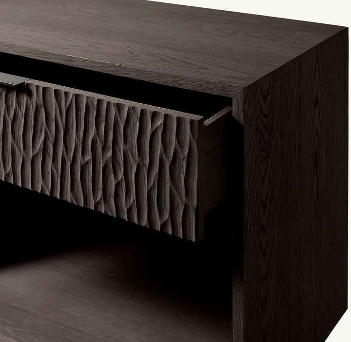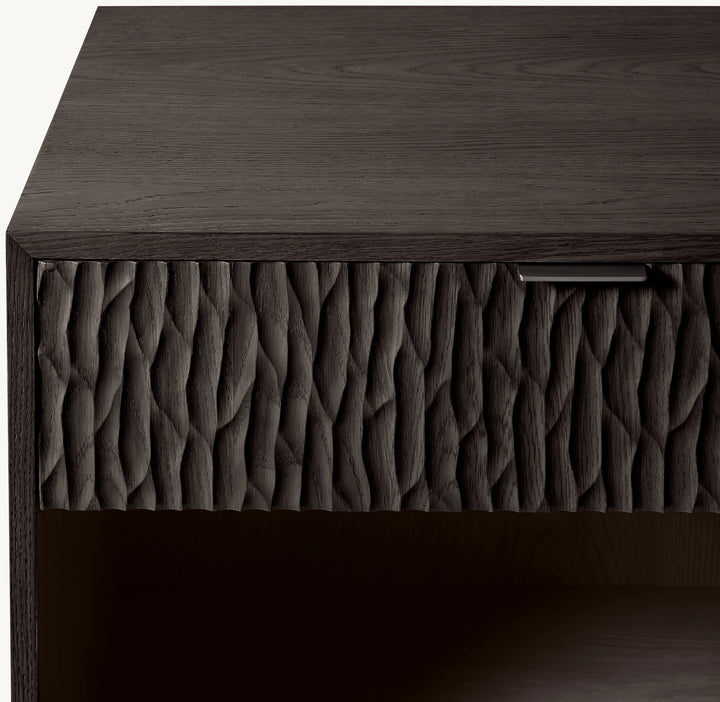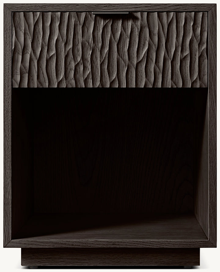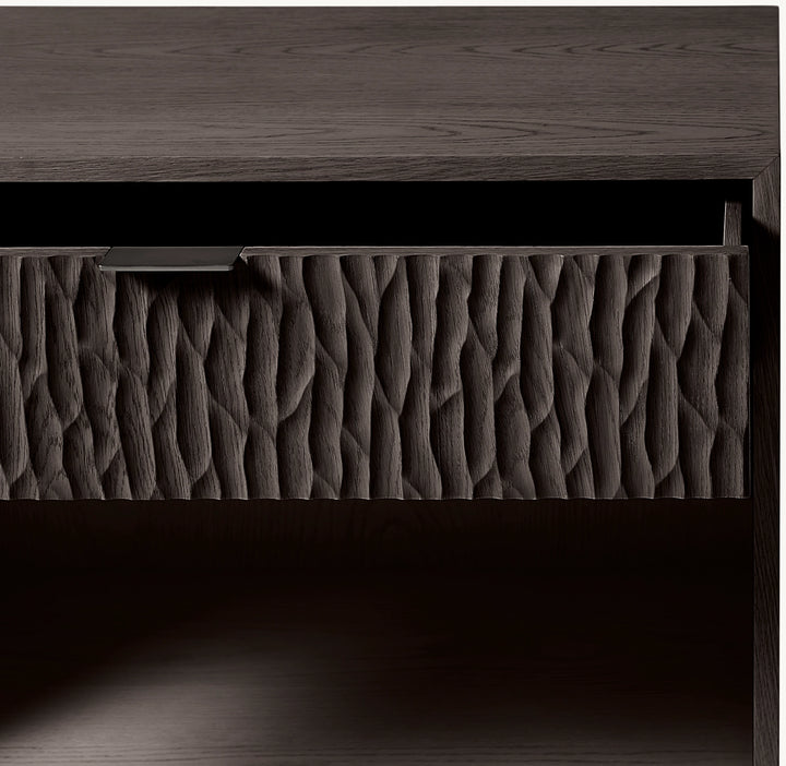 • Oak drawer fronts feature a deeply textured, chiseled surface in a meticulously crafted pattern
