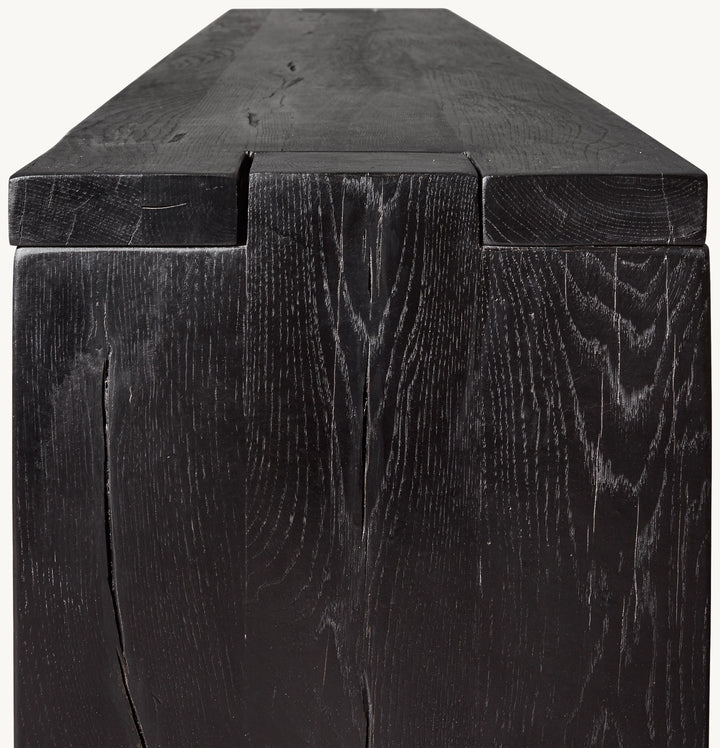 • Handcrafted of reclaimed timbers from decades-old buildings augmented with distressed white oak planks for consistency and stability