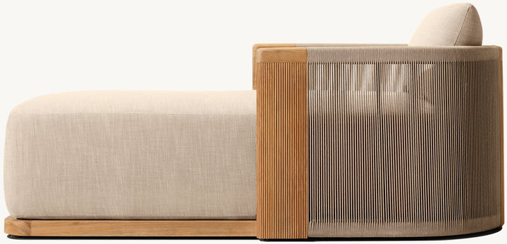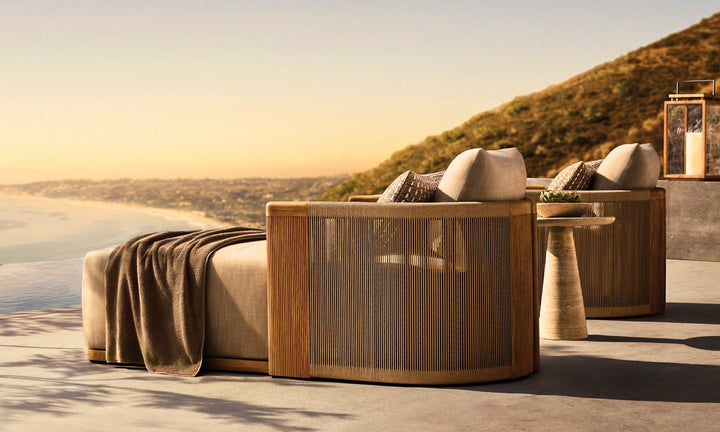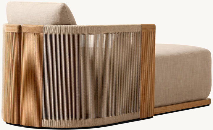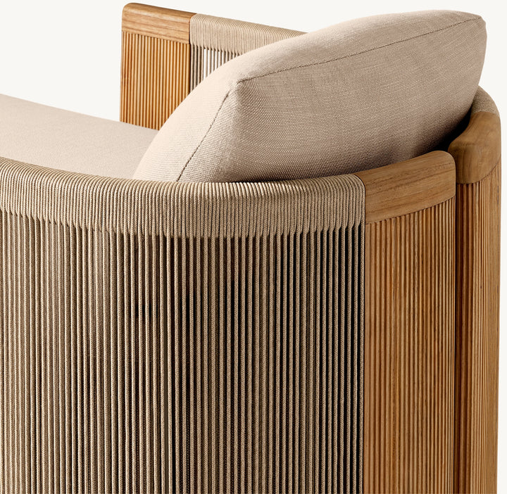 • Handcrafted by Indonesian artisans from sustainably harvested premium solid teak, the Striata collection features a curved tripod frame accented by handwoven all-weather rope