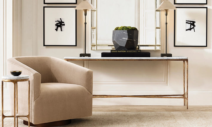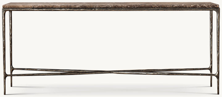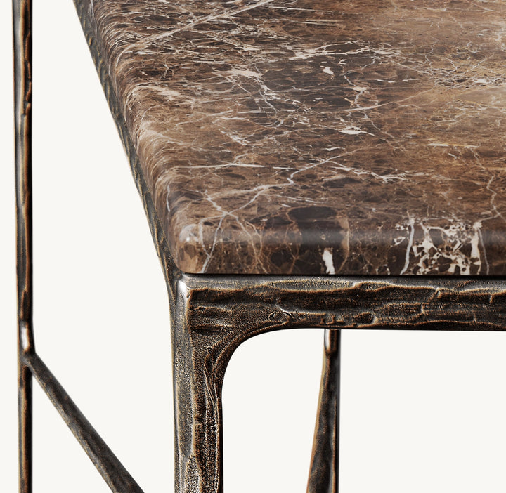 • Marble top is finished in an intensive, multistep process for a weathered patina that highlights the stone's distinctive vein patterning